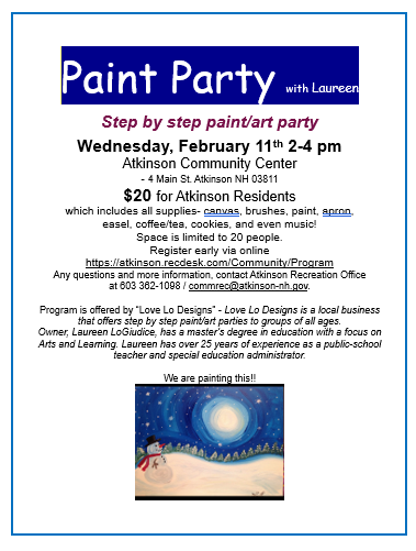 A Paint Party with Laureen: Wednesday, 2/11 2-4 pm, $20 for Atkinson residents and $25 for non-residents, which includes all supplies- canvas, brushes, paint, aprons, easels, coffee/tea, cookies, and even music! We are painting a snowman and full moon in the wintery scene. Space is limited to 20 people. Register early via online. https://atkinson.recdesk.com/Community/Program.